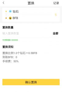 5、交易前,在我的钱包,把钻石置换成BFB,才可以交易,手续费比例50%,1:1,需要手有非赠送宝箱才可以交易,也就是要复投一次才可全卖,算了一下,能卖9个,黑市价高点,能6元,预计赚54元左右吧!