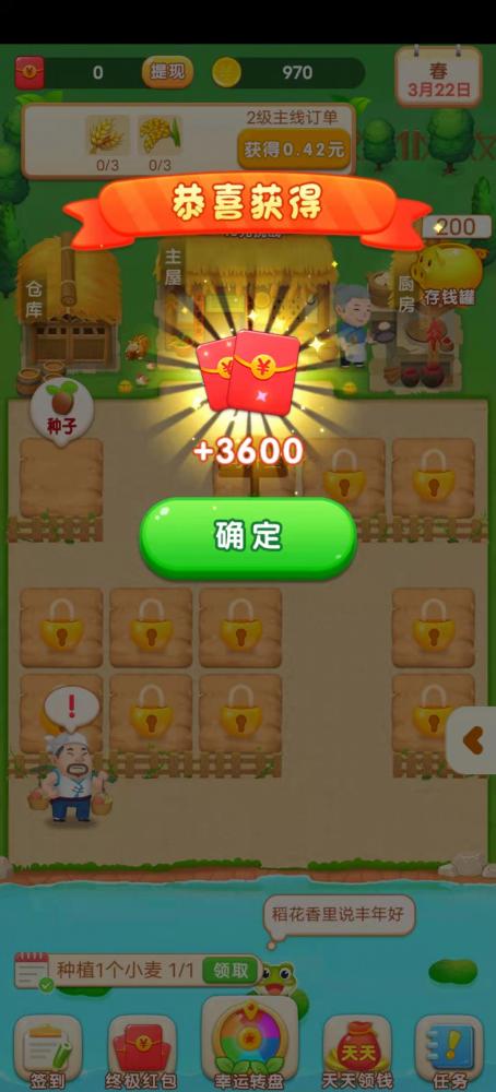 这个平台优点和缺点给大家讲一下,先是登录后按照新人流程走一步,不到一分钟时间,就可以直接提现了0.3元秒到账!后续想继续赚红包的话,就得完成种植订单条件,例如提现0.5元需要完成3级主线订单。