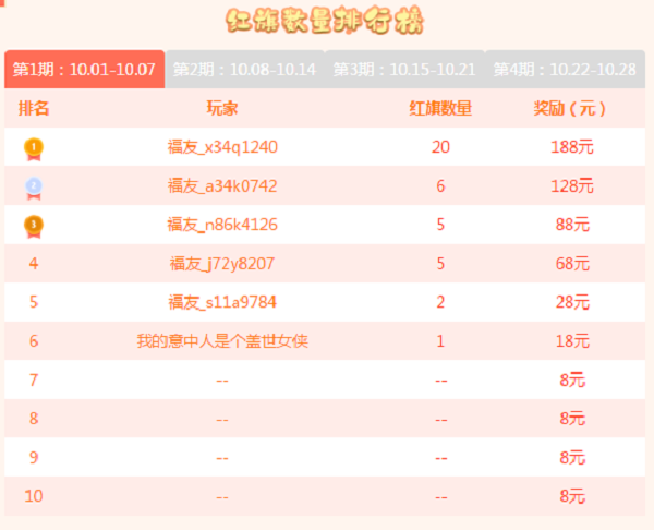 3、玩家每领取一次奖励都可以获得1个红旗,每期红旗数量最多的前10名玩家可获得榜单的福币奖励,若玩家红旗数量相同,则以领取红旗的先后顺序为准;