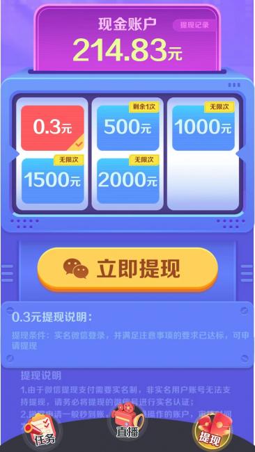 虽然兑换0.3元红包是顺利到账的,不过后面就开心不起来了,因为提现0.3元只有一次机会,后续就得最低满500元才能提现。