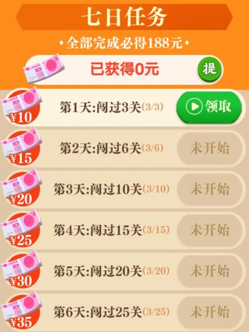 等玩家通过68关后,会开始第二阶段的任务,账户余额需要再凑够2888元,做完7日任务可以领取188元,一直通关失败的话,可以使用游戏内的免费提示道具,懒得玩的话,直接在首页点击底部的“福利”可以获得10次看广告领双倍奖励的机会。