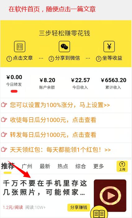 首先是下载一个转发文章赚钱app,然后打开软件就能看到如上图,随便点击一篇文章进去后,也可以挑选喜欢的内容,这样能提高点击率,赚钱更多。
