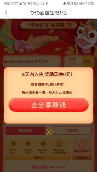OYO酒店其实从去年开始到现在就一直有“狂撒一亿”的活动。当时我索性参加了一下,也没怎么推荐,就简单推荐了4个人。然后基本上推荐一个人能拿到3元钱的奖励,同样的,被推荐者也可以拿到3元钱奖励。等于说你每邀请一个用户OYO酒店就需要付出6元钱。
